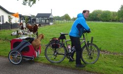 We lopen verder en langzaam lijkt Fleur toch wel moe te worden van dit zitten en alert zijn. Ze gaat weer eventjes liggen maar het is maar van korte duur. Ze leert het wel denk ik. Ze hangt uiteindelijk even wat verder achterin de kar tegen de zijwanden. Ook dat moet lekkerder zitten. Volgende keer misschien een opgerolde handdoek voorin leggen zodat ze net iets verder van de rand af blijft zitten en wellicht eerder zal gaan liggen.