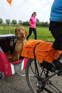Ondertussen zit Fleur braaf in de kar en ook al gaat ze niet echt liggen (alleen tweemaal een heel kort stukje) vindt ze het wel leuk volgens mij. Wat zal ze moe zijn straks!