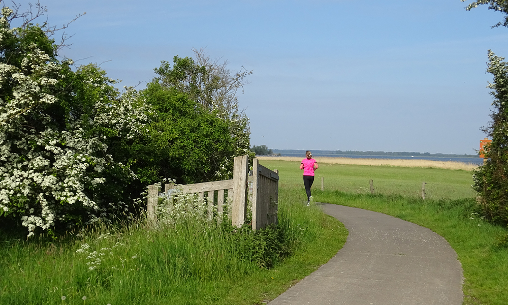 We hebben deze keer een mooiere route genomen. Bij de Kolmansweg zijn we rechtsaf geslagen en via Jan van de keuken zijn we verder gelopen, linksaf geslagen richting Veluwemeer en daarna weer linksaf terug naar de Bredeweg. Ik had dat van te voren uitgerekend en als langer rondje kon dat prima. Dat rondje is namelijk 14,5 km dus dat zou een mooie ronde zijn. onderweg zien we tot twee keer toe jonge eendjes. Dat is toch wel heel schattig en vorig jaar hebben we nauwelijks eendjes gezien op dit stuk. Het fietspad langs het veluwemeer is echt prachtig en heel rustig. Hier kan ik ook wel eens met Fleur gaan lopen want zij kan nog gewoon over de weg. Ziva vindt dat niet meer zo fijn.