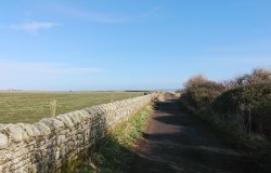 Dan zijn we bij een hek bij een veld waar vaak schapen lopen. We zijn op weg naar een mooi uitzichtspunt waar je zelfs Holy Island kunt zien liggen met mooi weer. Eerst nog even een paar kiekjes en ik laat ook de drone nog even vliegen.