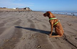 Verderop lijn ik haar even aan als we over het erf van de boerderij lopen en dat is maar goed ook want er liggen 2 dode schapen bij de deur. We hobbelen rustig verder en als we door het hek gaan, laat ik haar weer los. Ik maak een kiekje bij de bunker waar ik zo vaak een foto maakte van Zivaatje. Daarna hobbelen we verder.