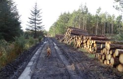 Ook hier wordt weer flink gakapt zie ik, net zoals bij ons in de omgeving. Zonde toch eigenlijk. Verderop zie ik een voederaar hangen voor de eekhoorns. De rode eekhoorns zijn in dit gebied in gevaar en worden bijgevoerd. Fleur vindt het allemaal maar lekker ruiken daar volgens mij.