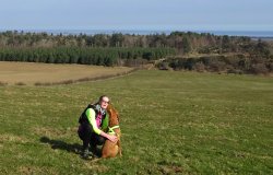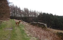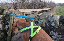 Na een tijdje ga ik weer verder met de route. Vanaf nu gaat het iets sneller denk ik hoewel er nog wel een lastig stukje aan gaat komen maar misschien valt het mee. Er komt nog wel een leuke uitdaging in de vorm van een muurtje met een lastige draad die eroverheen loopt. Ziva kon dat heel makkelijk ‘nemen’ maar Fleur heeft zoiets nog nooit gedaan natuurlijk. Maar zo ver is het nog niet. Eerst nog langs het bos lopen weer terug richting Swinhoe farm en daar over het terrein van de manege.