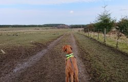 Aan het einde van het veld gaan we weer door een hekje en lopen we door het bos. Ze moet hier eigenlijk aan de riem maar dat is vooral vanwege de fazanten die hier gekweekt worden voor de jacht. Beetje rare bedoening. Ik hoor nog niks dus vooruit maar… lekker even los dan maar en dat gaat goed. Het is wel leuk om na het weiland even door het bos te hobbelen nu. Aan het einde van het bos lopen we weer richting een farm met een weg waar ik haar voor de zekerheid even aanlijn.