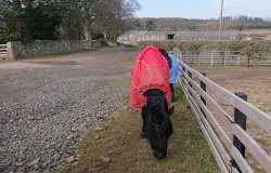 Zonder gedoe komen we dus weer bij Swinhoe farm aan waar ook de manege is. Even langs de koetjes die nog binnen staan en ons verrast aankijken. Het interesseert Fleur geen biet volgens mij en we hobbelen door. Over het erf van de manege waar tot mijn verrassing de paarden buiten de weide en de bak staan en ons achtervolgen richting het veld waar wij doorheen moeten. Voorheen had ik het ook wel eens aan de stok met die nieuwsgierige paardjes maar dan stonden zij in het veld waar ziva en ik overheen moesten en achtervolgden ze ons door de enkelhoge modder troep in het veld. Nu kan ik door het hekje glippen en even een kiekje maken van de paardjes.