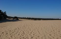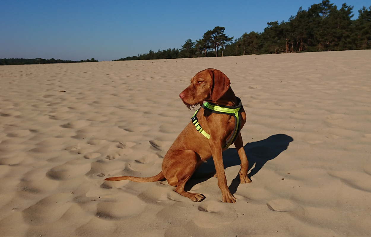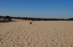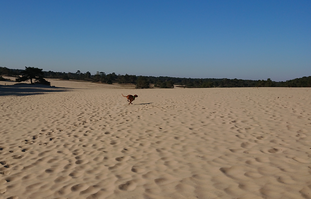 Aan het einde van de route gaan we nog even naar de zandverstuiving. Op weg naar het einde kom ik op een pad waar de auto’s van de werkers aan de boompjes midden op het pad staan. Bizar. Vorige kaar op het fietspad nu dus op het smalle paadje. Niemand te zien verder maar waarom staan ze nou niet gewoon op de parkeerplaats? De zandverstuiving is prachtig zo met de blauwe lucht en Fleur rent vrolijk heen en weer. Niet moe blijkbaar!