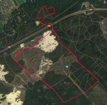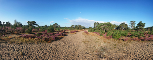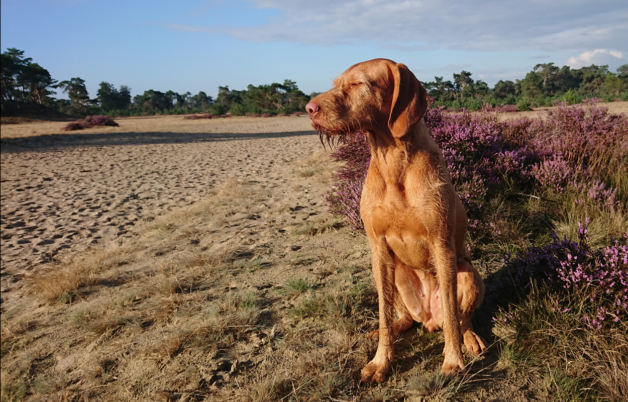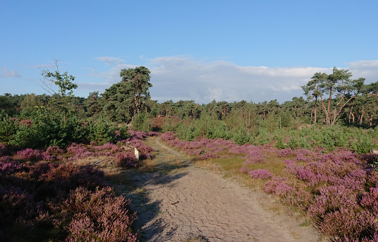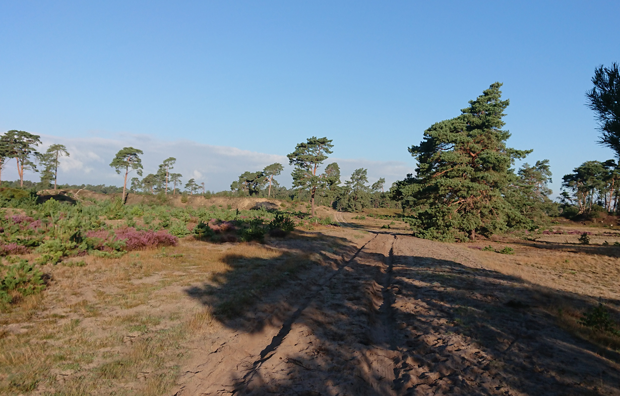 Vandaag ben ik eigenlijk onwijs moe na afgelopen week maar ik heb toch ook wel zin om te lopen. Ik word om 6 uur wakker maar het is nog idioot donker. Ik was al niet van plan om vroeg te vertrekken maar nu al helemaal niet. Ik draai me nog even om en dommel verder. Rond 7 uur sta ik op en ben snel aangekleed en klaar om te vertrekken. Gauw 90 gram brokjes in mijn zakje doen, water pakken voor woef en op pad. Giletje aan en compressie handschoentjes. Eerst wandel ik even aan de overkant en daarna ga ik van start. Er komt een hondje uit het bos achter ons aan en ik wacht even totdat de man het beestje heeft opgehaald. Omdat hij ook richting het zand gaat lopen, vertrek ik maar vast joggend en dat gaat verder prima. Woefje reageert al wat beter op het viaduct gelukkig. Ik hobbel over het fietspad en voer ondertussen de brokjes voor het ontbijt. Ik loop vandaag niet de lange route omdat we straks weer gasten hebben die vertrekken. Volgens mij ga ik die helemaal niet zien maar je weet nooit. Het is trouwens maar 10 graden en ik hou mijn giletje lekker aan. De handschoentjes gaan wel uit want dat is echt te warm uiteindelijk. Deze keer sla ik niet rechtsaf richting de heide maar loop door richting de Klarenweg. Ik wil eigenlijk het pad rechtsaf nemen door de heide daar richting de zandverstuiving. Op die manier hoef ik niet heen en weer over het zand. Dat is op zich een prima idee, ware het niet dat ik uiteindelijk tegen de zon in loop en dus weinig zie van de heide. Ik moet steeds omdraaien om te zien hoe het eruit ziet. Het begint nu wel achteruit te gaan qua kleur maar het is nog steeds wel mooi.