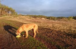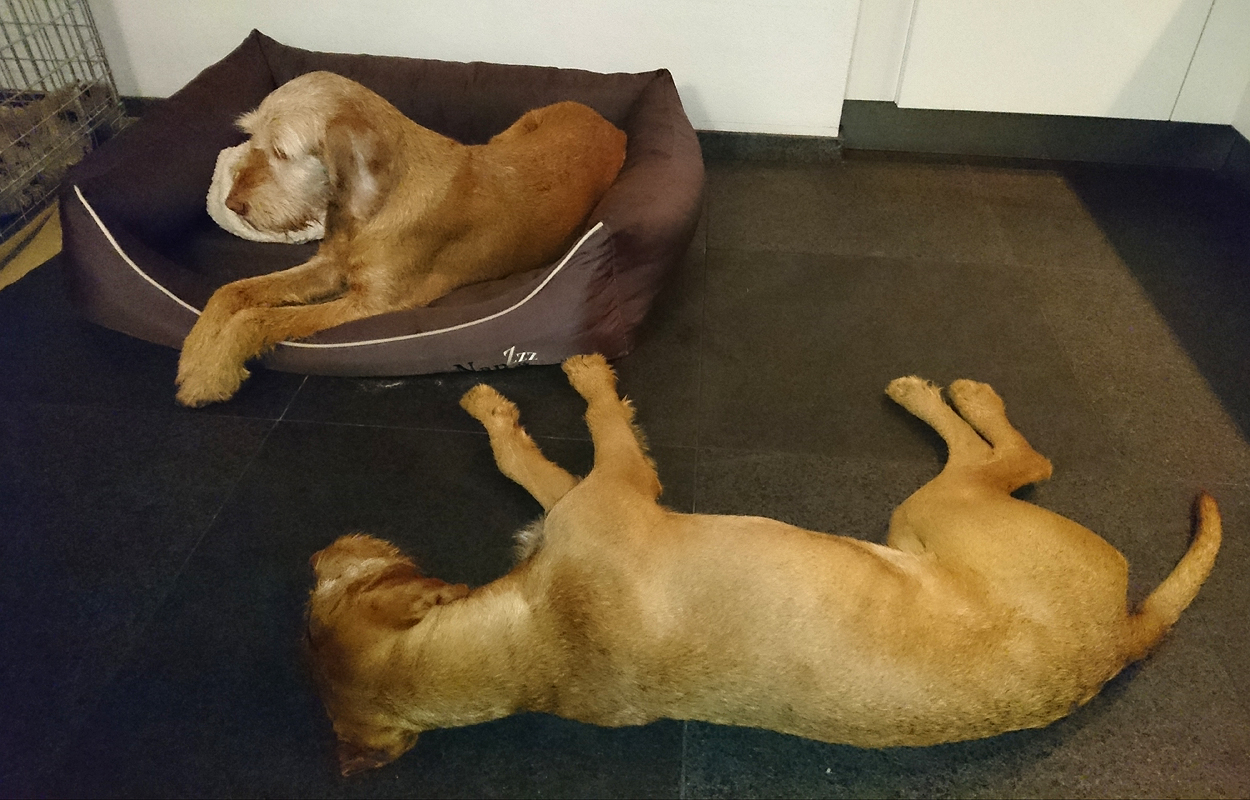 Vandaag ga ik eerst even wandelen met brava. Als ik thuis kom, sluit ik haar op in de bench en ga met Ziva op pad. Zo start ik dus al om 7.20 met de eerste wandeling. Daarna hobbelen Ziva en ik eerst weer naar de HWW en gaan daarna naar de overkant. Ze doet het prima en het is goed weer. Een mooie donkere dreigende lucht met het licht van de zon levert mooie plaatjes op onderweg. Als we terug komen, laat ik Brava nog even snel een plasje doen. In de avond liggen de dames zo lief bij elkaar! Ik hoop echt dat het wat wordt zo samen.
