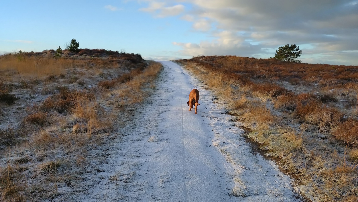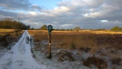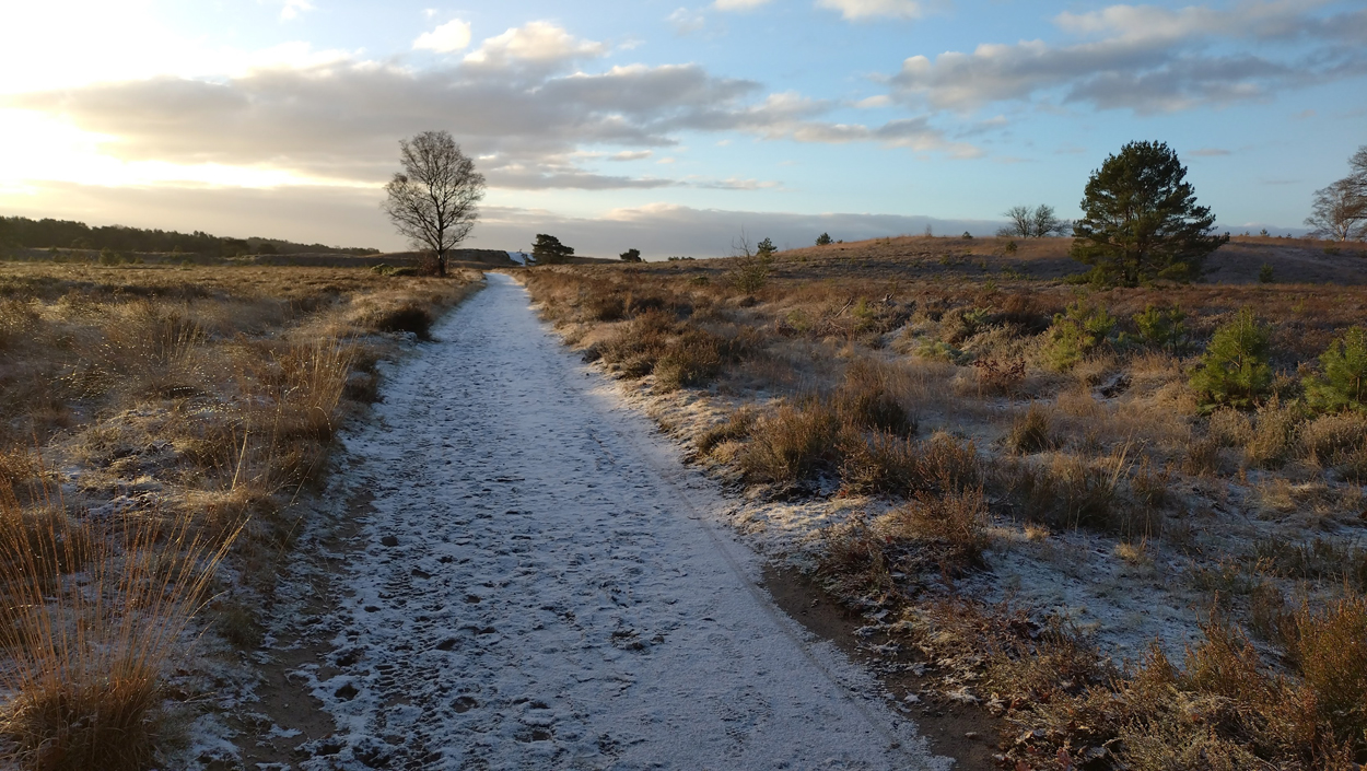 Vandaag weer op pad voor een rondje. Gisteren waren we in Aken maar waren we niet al te laat thuis en ik sliep best aardig. Alle seinen op groen dus voor een lekker loopje. We moeten eerst even bloedprikken in Nunspeet. Stefan en ik rijden apart zodat ik meteen door kan rijden naar Vierhouten en Stefan vast naar het huisje kan voor de laatste dingetjes voordat de mannen weer terugkomen zondag. Tot mijn verrassing ligt er een heel dun laagje sneeuw/hagel. Ik ga er echter van uit dat het straks gewoon weg is als ik in Vierhouten ben. Als wij thuis wat hebben liggen op het gras, ligt er verder nergens wat. Maar daar vergis ik me dus in, want het bos is een beetje wit maar alle paden door de heide zijn wit en glad. Ik baal als een stekker want hoewel het erg mooi is en het ook nog tamelijk zonnig is, is het gewoon glad. Had ik nou mijn Mafate speed maar aangetrokken zoals de vorige keer tijdens de sneeuw. Met die schoenen kom ik overal overheen! Maar goed, ik ga gewoon op pad en besluit langzaam te hobbelen. Echt hobbelen en weinig afzetten. De heuvel wandel ik op. Niet omdat ik moe ben maar omdat ik geen zin heb om te vallen. Daarna hobbel ik voorzichtig verder. Ik heb al een keer moeten stoppen voor honden, heb dus een stukje gewandeld en verder is het glad. Ik geniet wel van de omgeving vandaag en het lopen gaat zo onwijs makkelijk vandaag dat ik het wel leuk vind eigenlijk. In het aanlijngebied gaat het lopen beter. De grond is daar zachter en minder glad. Ik hobbel dus gewoon maar door. Ik neem de gewone route en ga niet het bos in want we willen nog even de kerst spullen uit het huisje weghalen en daarna naar Nunspeet voor wat boodschappen. Kleding voor Stefan en een kussen voor mij. Eigenlijk moet ik mijn jas ook wegbrengen voor een nieuwe rits. Zo mijmerend hobbel ik het hele stuk door het aanlijngebied non stop door. Ik hobbel verder onder de heuvel langs, een stukje over de heide en weer terug en richting het bos verder. Fleur loopt alweer los (ja dat waren dus 3 stappen wandelen) en ik stop met mijn hardlooprondje weer bij het pad met de bladeren niet ver van de auto. Niet slecht, want zo hobbelde ik gewoon weer 30 minuten non stop zonder problemen. Op deze manier gaat het RWR gewoon steeds makkelijker. Binnenkort moet het wegrondje er echt even van komen om te kijken of er ergens nog wat tempo verstopt zit. Zondag wordt dat niks want dan krijgen we sneeuw volgens de voorspellingen. Morgen misschien dan nog een rondje extra of zondag door de sneeuw maar dan op de juiste schoenen. Op naar de volgende ronde.