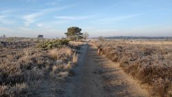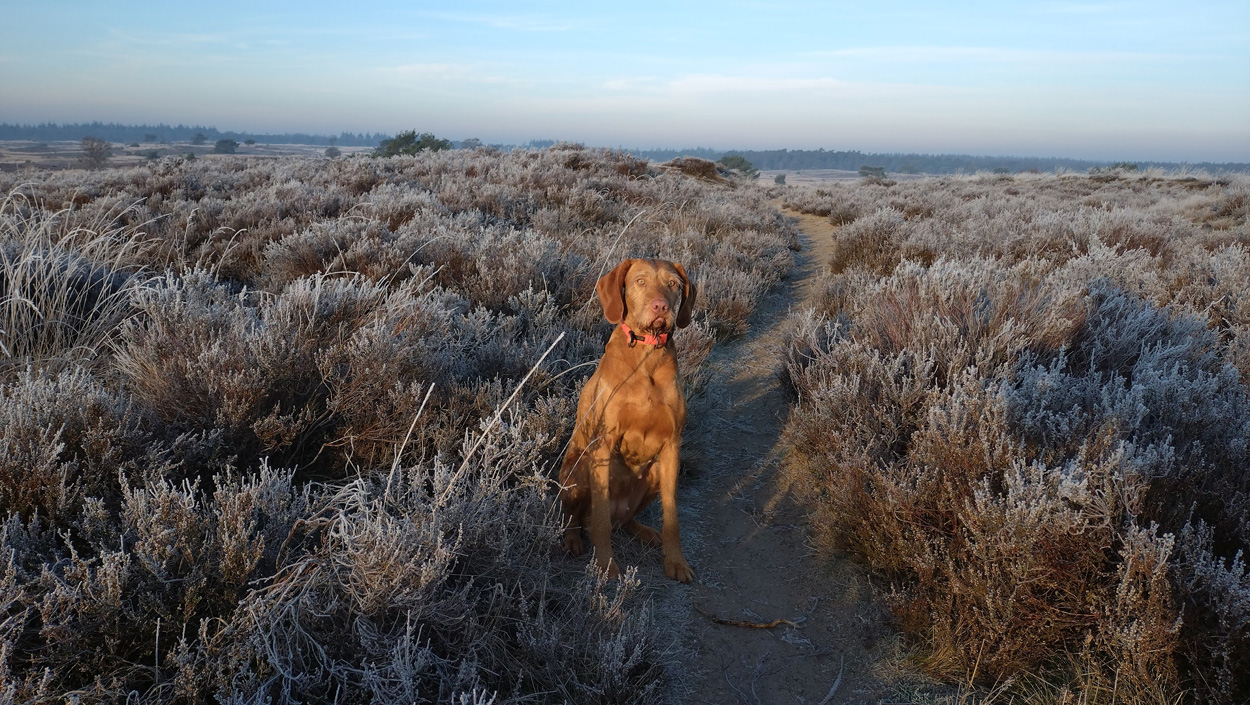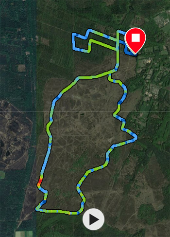 Gisteren was het mooi weer en heb ik een mooie lange wandeling gemaakt met Stefan. We liepen bijna het rondje dat ik tijdens het korte rondje loop, zodat hij eindelijk eens het ‘wolvenpad’ kan zien en ‘de schaapskooi’ waar nu zoveel wolvenpoep ligt. Overigens konden we niet eens alles terugvinden wat er lag maar er lag gelukkig nog wel wat. Vandaag ga ik dan weer op pad voor een rondje hardlopen. Ik heb geen idee hoe het loopt dus ik ga gewoon op pad en zie wel. Opwarmen, inlopen op het losloop gebied. Het is redelijk rustig dus ik kan mooi hobbelen voordat we echt beginnen. Bij het aanlijngebied gaat woefje weer aan de riem en ik besluit al snel om niet rechtsaf te slaan naar de pen maar door te lopen om de lange lus te lopen. Dat gaat best aardig. Het is koud maar zonnig en zonder wind. Ideaal loop weer en ook het zand is niet al te rul gelukkig. Het gaat best vlot. Deze keer lijkt de route korter en sta ik vrij snel weer bij de kruising vanaf de schaaps pen. Dat valt niet tegen. Fleur loopt op sommige stukken lekker voor me uit maar trekt niet. Toch geeft het net een extra steuntje en loopt het lekkerder dan dat ze achter me loopt waarbij ik ook nog eens op de riem moet letten. we hobbelen door en dat laatste stukje is nu zo bekend dat het ook echt opschiet. Als ik weer bij het bos uit kom, gaat het even mis met de riem die ineens onder de staart van Fleur zit. Dat irriteert mij omdat het me niet lukt om het snel weer goed te krijgen en Fleur doet moeilijk en zielig. Grrrrr. Ik lijn haar weer aan en we gaan nog een lusje door het bos maken. Ik kies nu het middelste pad, loop een rechthoekje met het lusje langs de heide en kom weer bij het eerste pad uit. Ik hobbel door tot het pad met de bladeren, klok en en laat Fleur lekker los voor een laatste rondje snuffelen en plassen. Na bijna 13 km (12.85) staan we weer bij de auto. Dat is toch 2x zo ver als tijdens de wandeling van gisteren en een stukje sneller en minder vermoeiend. Op naar de volgende run maar weer.