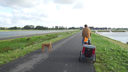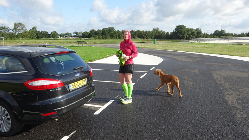 Vandaag na de tempo training van donderdag weer een lange op het programma. We starten weer vroeg vanwege de temperatuur die rap zal oplopen vandaag. Om 4 uur gaat dus de wekker en om 5 uur zitten we in de auto met de fiets, de kar en woef achterin. Woef zal niet het hele rondje meelopen, want omdat mijn kilometrage aardig omhoog gaat, mag zij ook wel even een stapje terug.