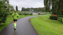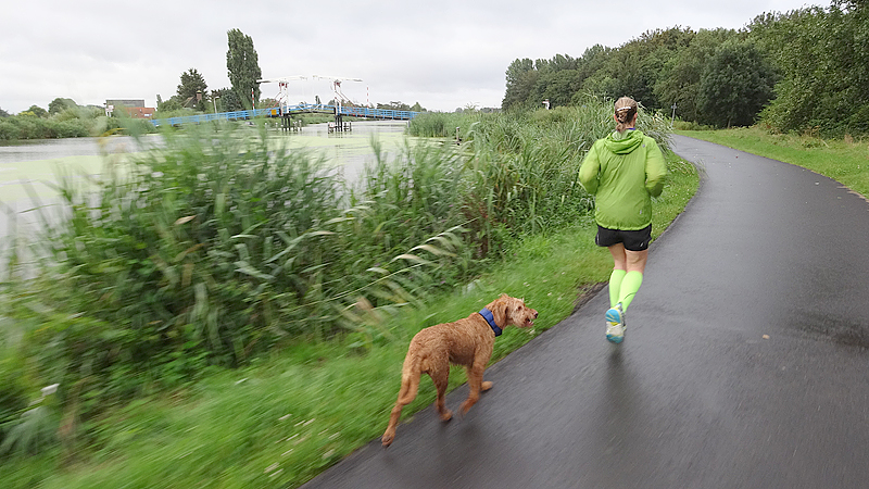 Al snel lopen we in de richting van de molenviergang. Een vervelend stuk weg dat schuin loopt dus even opletten qua benen en voeten en goed ademen op 2/3. Ik verbaas me er weer over hoe snel het allemaal voorbij gaat eigenlijk. Ik denk dat het toch wel uitmaakt dat mijn schema door de week fors is aangepast ten opzichte van vorig jaar. Toen liep ik eigenlijk vrij weinig door de week en dan zijn de langere afstanden ook een veel grotere ‘aanslag’ op het lichaam. Ik vind alleen de timing van de temporun zo vlak voor de lange run niet ideaal maar dat komt vooral doordat de temporun mijn zwakke punt is. Woef heeft het reuze naar haar zin. Ze rent op en neer en jaagt achter haasjes aan die zielig in de regen zitten te dommelen totdat zij aan komt stuiven. Kennelijk is madam totaal nog niet moe, dus we nemen haar in ieder geval de hele ronde rond het water nog mee. Het regent nog steeds en S is werkelijk zeiknat al. Later zal hij me opbiechten dat hij zich even afvroeg waarom hij eigenlijk mee moest. Nou ik ben er heel blij mee, en vind het ook super lief. Ik word verwend onderweg met een watertje, wat te eten, een sponsje en andere onzindingen die ik denk nodig te hebben. Overigens liep ik eergisteren op de temporun gewoon met mijn rugzak en dat gaat natuurlijk ook prima. Maar zo op de langere runs is het zo fijn en het is ook nog gezellig zo samen (enne… het is ook wel goed voor S. om lekker even te fietsen maar dat vertellen we er niet bij natuurlijk).