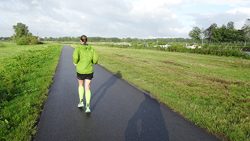 We slaan linksaf en zullen straks tegen de wind in een heel aantal kilometers weer lopen richting de ophaal brug aan de andere kant. Even doorbuffelen dus. Maar eigenlijk valt het best mee en grappig genoeg kan ik tegen de wind in makkelijker de ademhaling op 2/3 houden dan met de wind ‘mee’. Overigens is het zijwind maar niet echt prettig. Ik heb nog steeds mijn Montane jasje aan en als het even zo doorgaat kan ik het straks niet meer uittrekken omdat ik dan veel te warm en te vochtig ben zo in deze wind. Maar goed, voorlopig is het ook een prima test om te kijken hoe het jasje draagt in deze omstandigheden. Het is vrij warm, maar ik ben zeker niet aan het stomen!