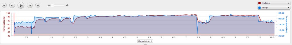 Maar na 5 km stop ik toch even met de bedoeling om dan maar 2 laps van 5.000 mtr te lopen om toch aan de afstand te komen die voor vandaag was opgegeven. Na 500 meter starten we weer en dat gaat ook prima. Ik loop ongeveer net zo snel als in de eerste lap en met een fraaie hartslag. Volgens mij is dit dus ook verbeterd want ik vind 6.12 min/km op deze hartslag keurig en het is totaal niet vermoeiend. Blijkbaar schuif ik toch weer langzaam richting de 6 min/km. Maar als ik aan het einde van de roeibaan kom, vind ik dat woeffie er ongelukkig uitziet en besluit ik te stoppen. Zij kan immers zelf niet aangeven wat ze wil of wat er is.
