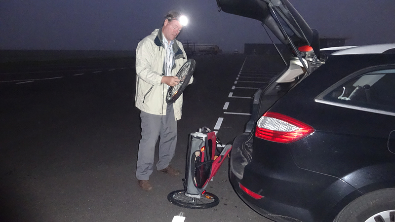 Vreemd genoeg had ik weer het idee dat ik opnieuw moest piesen en meer, en baalde ik daar enorm van. Maar na de eerste kilometer warmlopen, startte ik de klok voor de kerntraining van 35 km. Daar gingen we. Het liep wel aardig, hartslag bleef mooi en de metronoom tikte braaf. Ik liep tot het einde van de baan en keerde daar om om onderlangs weer terug te lopen. Op die manier zou ik de eerste 4 km alvast in de knip hebben bij de parkeerplaats. Maar waar was S. nu? Pas aan het einde zag ik het lampje van de fiets. Hij was weliswaar de baan op gereden, maar niet helemaal tot het einde en kon me dus niet zien door de mist. Hij had me simpelweg gemist!