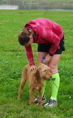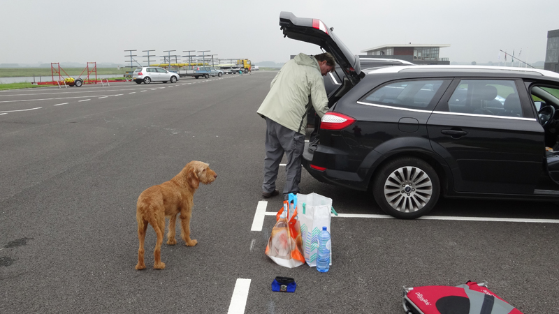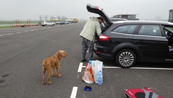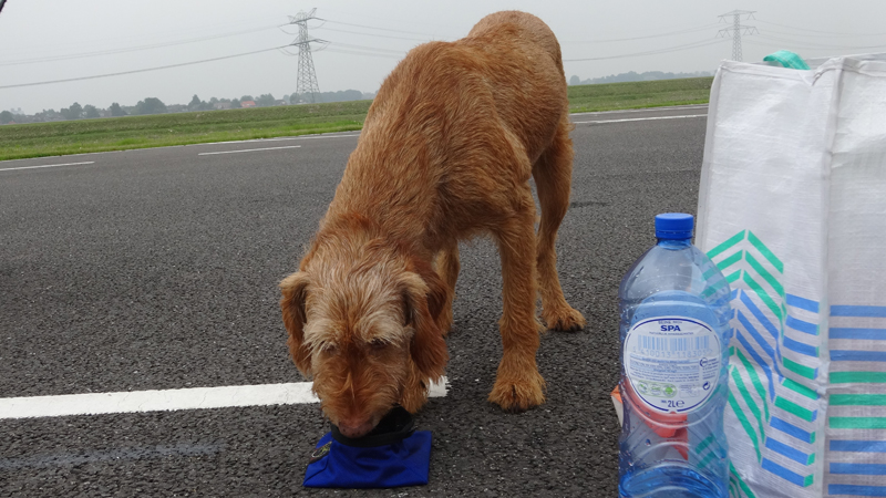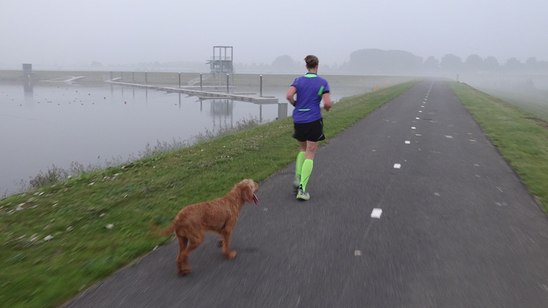 Het was kloterig weer, heel mistig vanmorgen en al warm na een warme nacht waar het kwik niet onder de 16 graden is gekomen. We waren rond 06.15 bij de roeibaan en toen was het echt mistig. Zo mistig zelfs dat we even moesten opletten waar de wegzafzetting stond die een put in de weg moest afbakenen. Maar we kwamen veilig aan op de parkeerplaats en al snel waren we op weg. Ik had afgesproken dat ik alvast zou gaan warmlopen en vast op de baan zou gaan lopen, terwijl S. de kar en de fiets ging klaarmaken. Dat scheelt weer tijd, want het is een hele ruk zo met deze afstand. Zo gezegd zo gedaan en woef en ik gingen op pad.