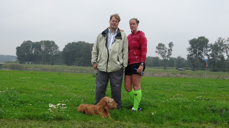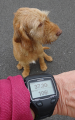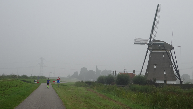 Over het bruggetje dan maar en richting de molens. Ik liep aanvankelijk even alleen omdat S natuurlijk de hond in de kar aan het proppen was. Maar op een gegeven moment hoorde ik onze loeihond al aankomen en waren we weer samen. Ik heb nog steeds een hekel aan dat stomme stukje weg richting de molens. Weer terug langs de snelweg en weer de andere kant op. Stom genoeg merkte ik dat ik de metronoom niet meer lekker bij kon houden maar toen ik keek, merkte ik dat ik de cadans op 172 had gezet in plaats van op de gewenste 168. Slim! Vanaf dat moment was het ritme er een beetje uit en zette ik de metronoom maar uit. Dan maar eens kijken of ik het zelf kon op mijn ademhaling en welk tempo daar dan bij zou horen. Ik had ook alleen maar afstand en tijd in beeld vanaf dat moment en zat onderweg enorm te rekenen wat de kilometer tijden dan zouden moeten zijn om op 6.45 min/km te blijven lopen.