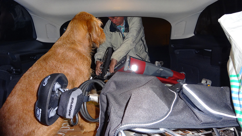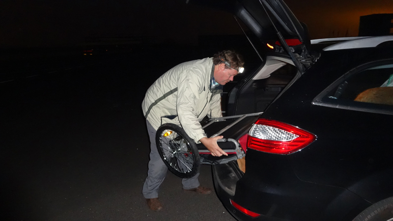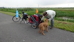 Het is nog een beetje schemerig, want we vertrekken even voor 6.30 bij de baan. Je merkt goed dat het alweer later in het jaar wordt! Maar het zal weer een warme dag worden, dus voor de hond is het beter als we een beetje vroeg vertrekken. Ik ga vast op weg, terwijl S. de kar en de fiets verder klaar maakt. Da scheelt tijd, want dat inlopen gaat langzaam. Woeffie loopt lekker met me mee en went er al aan dat S niet meteen meekomt. Vorig week stond ze nog steeds achter zich te turen waar hij nou bleef!