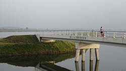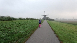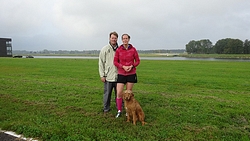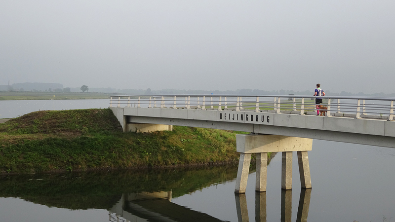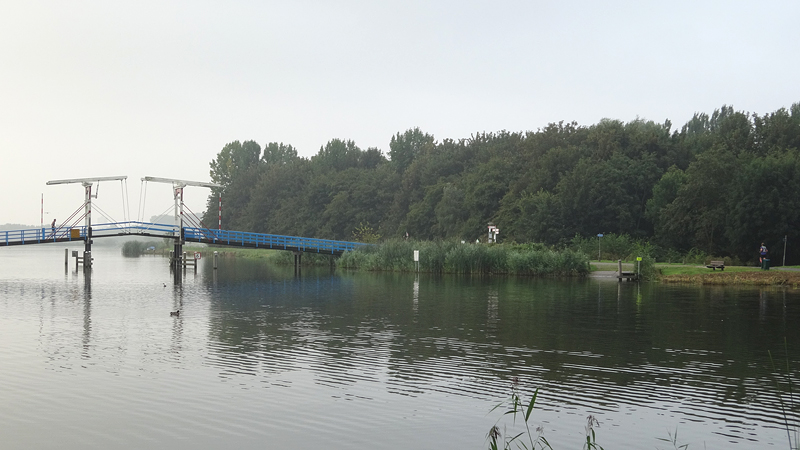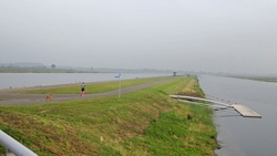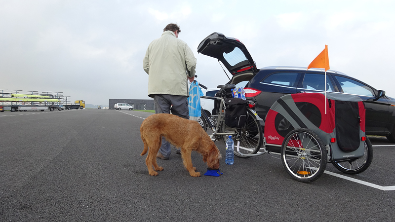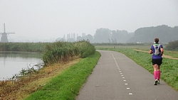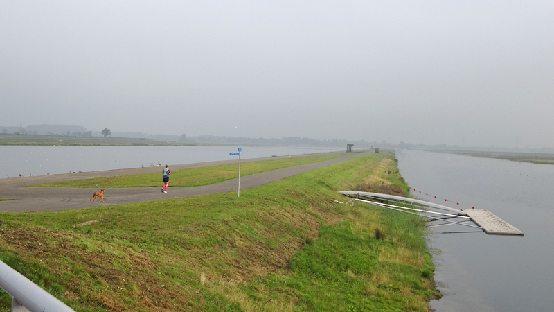 Heen en weer over de baan, terug richting de auto en dan de ronde beginnen die weer rond de plas zal gaan. Als we bij de brug uitkomen, zal woeffie in de kar gaan. Na de vermoeiende run van donderdag, is de 16 km voor haar vandaag welletjes. Aan het einde mag ze er weer even uit! Maar voorlopig zijn we nog niet bij de brug.