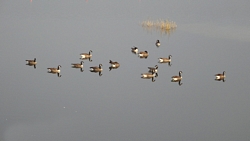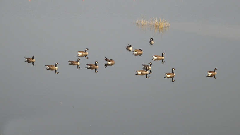 Het rondje was verder OK. Na de ophaalbrug weer rechtsaf rond de baan zodat woeffie uit de kar kon. Dat vond ze wel lekker en rond de banen kunnen we makkelijk allerlei afstanden lopen. Er waren weer volop ganzen op het spiegelgladde water en ook weer veel ganzenkak op de weg. Maar goed, dat hoort er inmiddels een beetje bij zullen we maar zeggen.