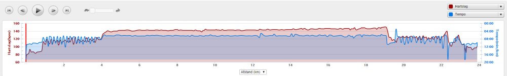 Onderstaand het overzichtje van hartslag en pace. Even warm lopen met RWR, daarna de 15K op vlak tempo met mooie hartslag, daarna weer de cool down met RWR.