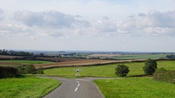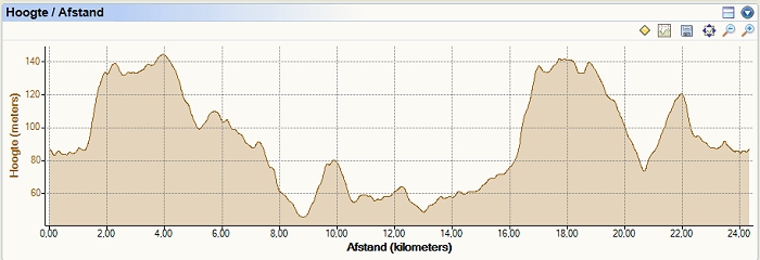 Na 13 km lig ik nog steeds op een vlak tempo onder de 7 min/km en daar komen we op de ruim 2.5 lange klim. Ik zeg tegen S. dat hij maar lekker even vaart moet maken om te zien of hij deze keer de klim op de fiets voor elkaar krijgt. Ik hobbel rustig verder en let op ademhaling en armzwaai. Als ik doorsukkel, zie ik ineens dat S. is afgestapt en moet wandelen. Niet gehaald deze keer. Komt wel een volgende keer denk ik. Ik hobbel rustig door, adem krachtig met 2/2 uit zodat ik weliswaar klink als een postpaard maar toch gestaag de heuvel op klauter. Het gaat best goed. Na de klim even vlak om weer een tweede klimmetje te doen en dat valt een stukje zwaarder. De teller staat inmiddels bijna op 16 km in deze continu lap.