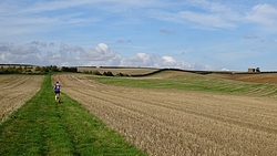 Ik doe snel de andere schoenen aan en we gaan weer op weg voor het laatste stukje. Even over de weg, rechtsaf het veld in en over het hobbelpad naar beneden en weer omhoog naar het dorp. Dat valt echt niet mee en ik zie geen zak door mijn donkere bril. Misschien is het allemaal zachter geworden door de regenbui van gisteren, maar het loopt voor geen meter. Liep ik werkelijk in maart 60 km onverhard een trail? Pfffff. Nou nog even doortrainen dan maar!