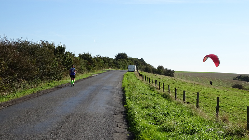 Het was echt prachtig en ik hobbelde vredig over de route. Er was iemand aan het parasailen of gliden (geen idee) en we zagen een vreemd soort vlieger die vogels op afstand moest houden. We konden erg ver kijken en het was echt mooi.