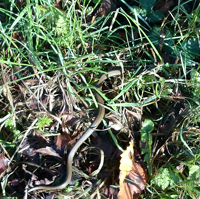Over het veld was inmiddels gesneden koek. Het blijft een beetje vreemd om soms over een akker te lopen waar de weg wordt aangegeven door twee zakken op een paal. Maar eerlijk is eerlijk: hier staat tenminste iets aangegeven en is over de akker een soort pad geploegd. Op veel akkers is niets en moet je het maar uitzoeken, ook al is het een officieel wandelpad. Daarna staken we de weg over om rechtdoor te lopen (eerder gingen we rechtsaf over een drukke weg weer richting Viking Way en dat was geen succes). Daar zag ik een ringslangetje op de weg zonnen. Toen ik dichterbij kwam, kroop het dier snel de veiligheid van het gras in en is de foto dus erg onduidelijk zo tussen de blaadjes.