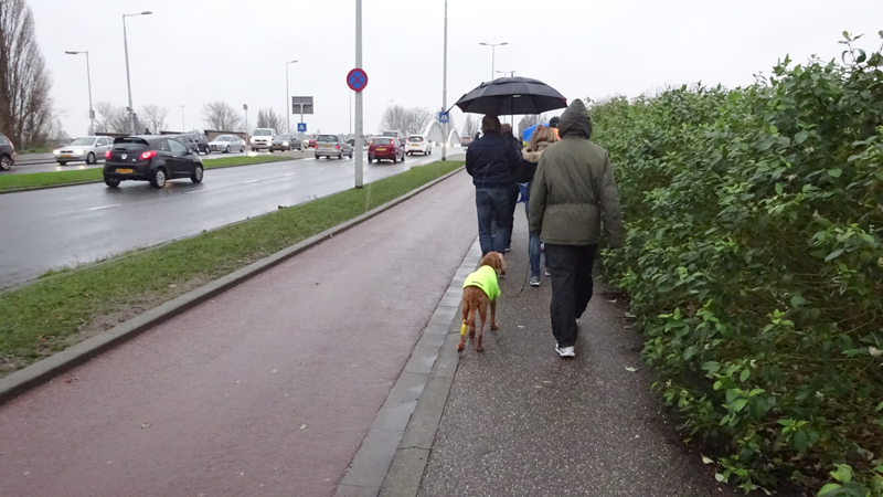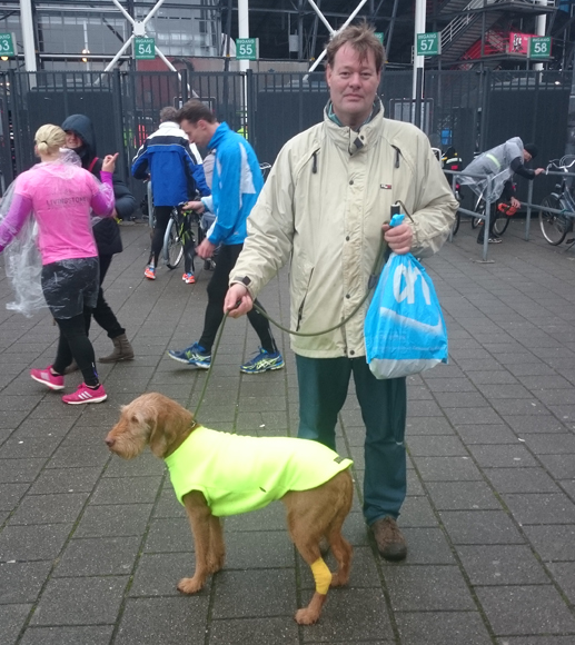 Dit jaar niet. Ik heb alleen maar MAF trainingen gedaan op max HF van 138 en bovendien al weken slecht geslapen, een week helemaal niet gelopen en twee dagen geleden nog getraind alsof ik op klompen liep. Ook was ik totaal niet voorbereid. Ik had snel alles klaargelegd wat ik aan wilde trekken en was daarna met S. naar de kwekerij gegaan om nieuwe bomen en planten te halen voor de tuin. Toen we terug kwamen had woef haar bandage losgerukt en heb ik eerst de wond en de poot verzorgd en me in allerijl omgekleed. Omdat woef meteen aan haar poot begon te rukken toen we in de bijkeuken stonden, besloten we haar uiteindelijk maar mee te nemen met haar jasje aan. Konden we tenminste opletten wat ze aan het doen was. We gingen er eigenlijk meer heen met het idee dat ik toch had willen lopen vandaag. Het was nog pest weer ook, regen en wind, echt niks aan.