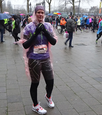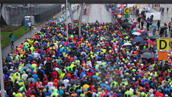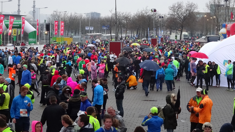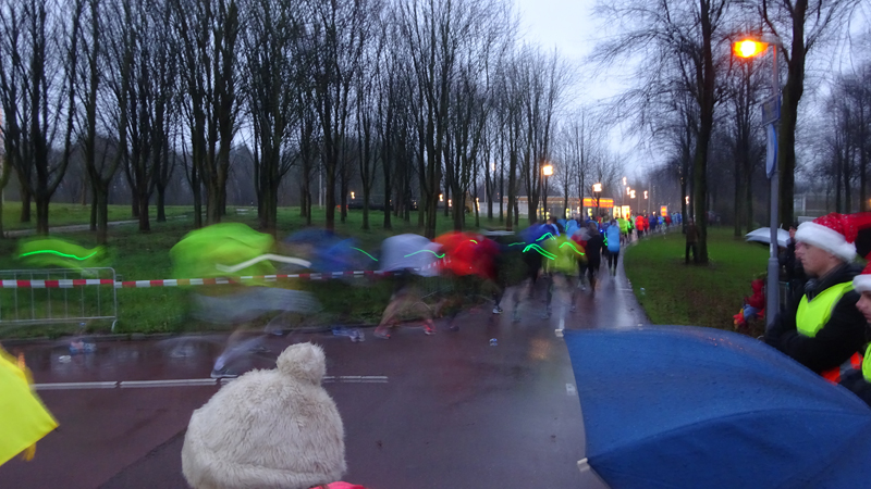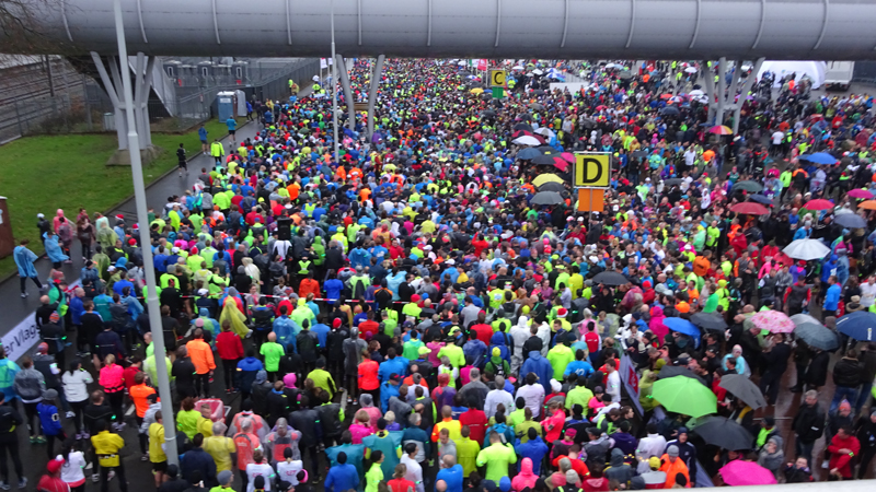 Toen het bijna tijd was, trok ik mijn jas uit en de poncho aan. Niet handig achteraf want vanaf de poncho druppelt alles nog harder op en in de schoenen en op de broek. Volgende keer gewoon in de regen blijven staan. Maar dat wordt niet meer bij deze loop. Daarover later meer. Het wachten duurde vrij lang, omdat de eerste startgolf nauwelijks op tijd weg kwam in die 10 minuten. Maar uiteindelijk konden we dan toch vertrekken. Totaal liepen bijna 12.000 lopers mee: teveel voor dit evenement dat totaal uit zijn voegen gegroeid is, zoals ik aan de finish zou merken.