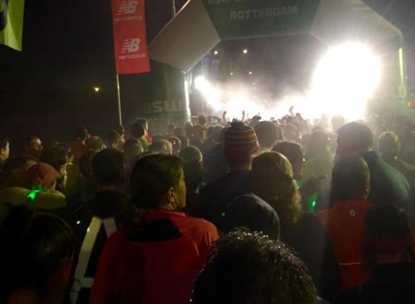 Op de brug naar Rotterdam was het al hartstikke druk en uiteindelijk vonden we met moeite alsnog een parkeerplekje en konden we richting de Kuip lopen waar de start zou zijn. Het regende en het was echt gezellig (niet dus). Maar goed, we kwamen op het plein en ondanks het feit dat mijn ophaal bonnetje voor het lampje was weggewaaid onderweg, kreeg ik een lampje. Ook alweer leuk. Daarna het wachten tot de start.