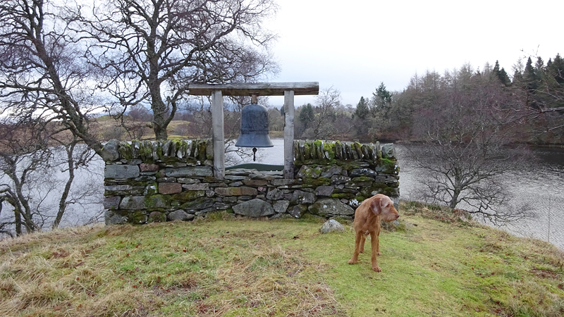 Er hangt een een of andere grote bel en het is een mooi plaatje zo en heel rustgevend. Als ik om me heen kijk, zie ik in de verte een sort bruggetje. Blijkbaar kan je over het water heen en daar loop ik dus ook nog even heen. Ineens zie ik paaltjes met een rode stip. Een pad? Op mijn kaart staat niks, maar er loopt echt een wandelpaadje rond het watertje. Sterker nog, er lopen drie paden want er zijn drie kleurtjes. Ik kies voor de rode want die gaat volgens mij om het hele watertje heen.