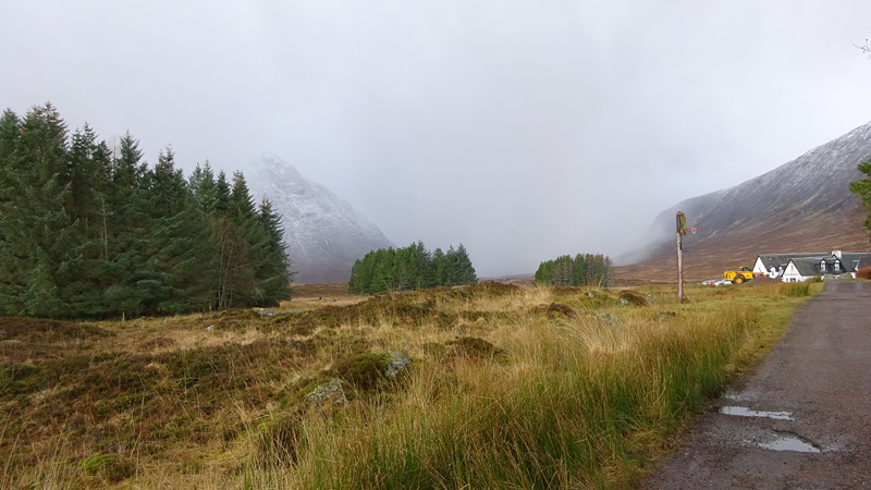 Uiteindelijk moet ik toch weer eens terug. Ik ben over de top op ruim 400 mtr en merk dat ik weer een stukje aan het dalen ben. Dat geeft niet dat ik straks weer omhoog moet, maar het betrekt inmiddels weer en aangezien het nog hard waait, ga ik liever terug en loop eventueel nog een stukje voorbij Kings House Hotel de volgende stage van de WHW op. Eerst maar terug. Met moeite draai ik om, want ik zou nog zo graag verder gelopen zijn. Maar ja…. je loopt met verstand en met het besef dat je gewoon nietig bent daar in de bergen en het bovendien eigenlijk ‘slecht’ weer is.