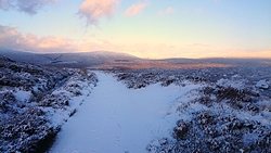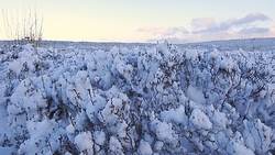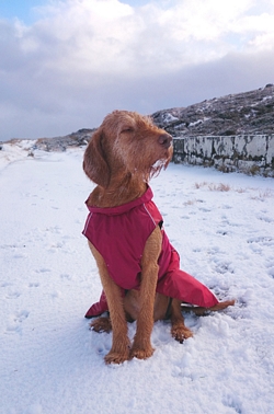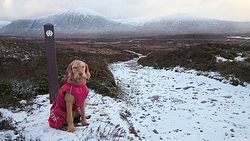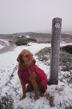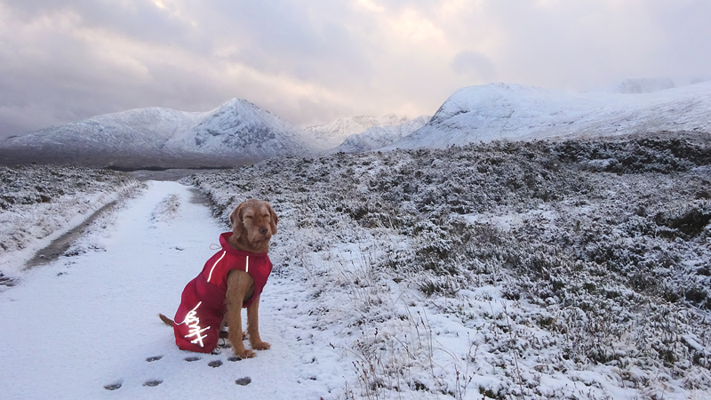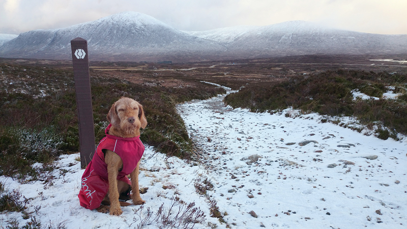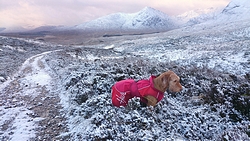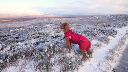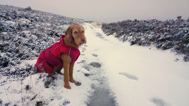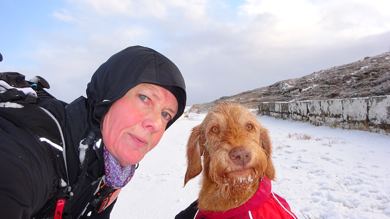 Het waait behoorlijk want op een van de foto’s hierboven zie je het oortje van woeffie in de wind wapperen. Zij vond vooral de grouses helemaal geweldig die overal wegfladderden uit de sneeuw. Maar ze breef braaf bij me en zefs toen er eentje bleef zitten en zij naderbij sloop, ging ze er uiteindelijk niet op af gelukkig.