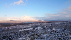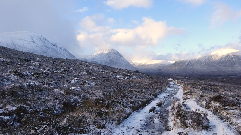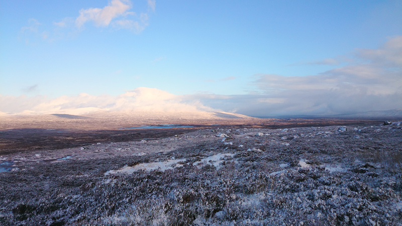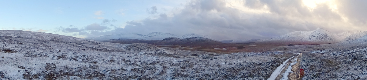 Toen het opklaarde, kreeg ik ook zicht op de bergtoppen. Zeker het uitzicht achter me was adembenemend. Ik ben ook heel vaak gestopt om te kijken. Dit moet je echt beleven. Alleen maar doorrennen met de blik op de grond is niet zo zinvol. Hardlopen is hier meer het doel om wat verder te komen dan met wandelen en dat lukt prima. Voor me wordt het uitzicht ook ineens een stuk mooier, als ik zicht krijg op de meertjes van Rannoch Mor. Gweldig gezicht, en ik ken het alleen maar vanuit de auto als we over de weg naar huis rijden na het herten fotograferen in de Glen. Wat een belevenis om hier zo te lopen met waf in dit weer. En wat bof ik dat het even zo mooi opentrekt zodat ik alsnog alles kan zien.