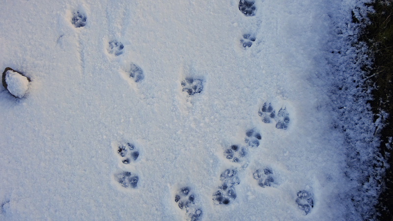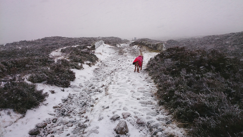 Het is inmiddels ook harder gaan sneeuwen en ik ben verrast dat er in no time echt een laagje sneeuw ligt op het pad.