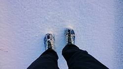 Mijn schoenen deden het prima op de verse sneeuw. Soms lag er onder de sneeuw een stroompje water, en dat zorgde wel voor natte voeten.