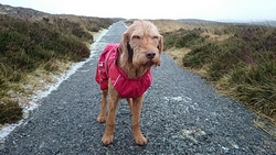 Wafje vond het alweer helemaal leuk en rende blij voor me uit. Helaas ging het hard regenen na 300 meter en besloot ik haar toch haar jasje snel aan te trekken. Alles van mijn rug dus en snel de jas eruit. Gelukkig heb ik inmiddels van Exped waterdichte zakken in mijn rugzak in verschillende kleuren, dus ik kon snel vinden wat ik moest hebben en de rest bleef lekker droog. Een verademing dus.
