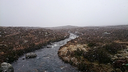 Ik had gelijk, het weer slaat om en het wordt donker, somber en ineens klettert het van de regen. Ik ben natuurlijk weer van de top af en dus is de sneeuw gewoon regen geworden en is het niet meer prettig om te lopen en zie ik ook niets meer omdat het dichtgetrokken is.