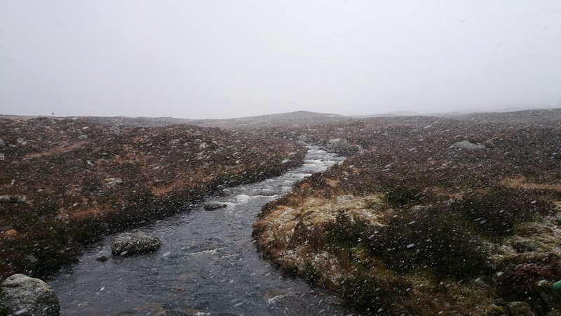 Zo hobbelden we verder. Ineens begon het te sneeuwen. Dat was met de keiharde wind geen pretje en best pijnlijk op mijn wangen. Maar ik wist dat de wind straks anders zou staan omdat we moesten afslaan. Ik was ook goed gekleed in mijn peperdure Nike Vapor Windrunner Jacket (gelukkig in de sale maar ik begrijp inmiddels waarom dat jack 179 pond moet kosten). Daaronder een lange mouwen shirt en zelfs de rain sleeves. Je hebt geen idee wat het weer met je doet in de bergen. Ik ben tegenwoordig gauw warm, maar een echte stormachtige wind met regen/hagel/sneeuw in de bergen voelt echt bijzonder koud zonder goed kleding. Ik denk ook eigenlijk dat ik eergisteren (met de afgebroken ronde) niet goed gekleed was uiteindelijk. Vandaag wel, en ik heb me ook de hele route echt comfortabel gevoeld. Ook bij stilstaan en foto’s maken heb ik het geen moment koud gehad en dat is belangrijk.