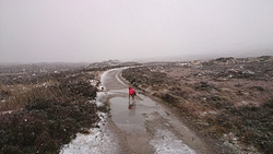Ik hoop maar dat het straks minder waait of niet meer sneeuwt, want anders heb ik op de terugweg dit allemaal pal in mijn gezicht en dat zou helemaal afzien zijn. Nu is het prima te doen en het wordt vast straks beter. Ik vind het wel spannend en terug ga ik zeker niet. Daar is ook geen reden voor. Het is veilig, het pad is zichtbaar en het is niet zo winderig dat je de berg afwaait ofzoiets. Het is alleen even oppassen dat je niet over stenen zwikt of struikelt want met het laagje sneeuw is het allemaal natuurlijk een beetje verborgen.