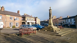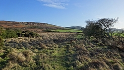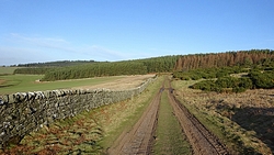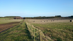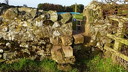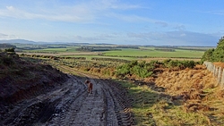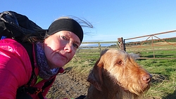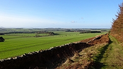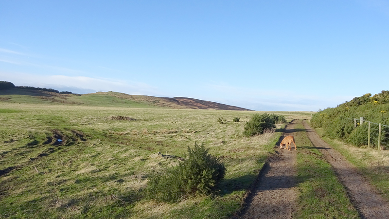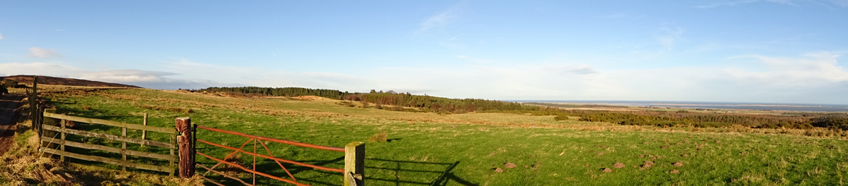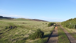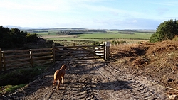 De route is verder gesneden koek. Langs het mooie uitzicht, richting Swinhoe farm, over het veld bij de rijschool. Als ik daar over het veld loop, staan er drie grote paarden die snuivend snel op ons afkomen. Doe mij maar koetjes want ik heb geen idee wat deze dieren nu van me willen. Misschien even aan wafje ruiken maar ze blijven met me mee lopen en zo lopen we als quintet over het veld. Drie paarden, een hondje en ik. Ik ben blij dat ik deze keer de weg weet, want er staat hier niets aangegeven en je moet schuin het veld oversteken en dan door een hekje. Daar kunnen de paarden niet doorheen en al snel zijn we weer een hobbelend duo.