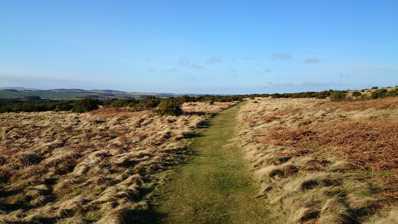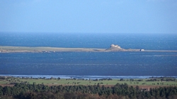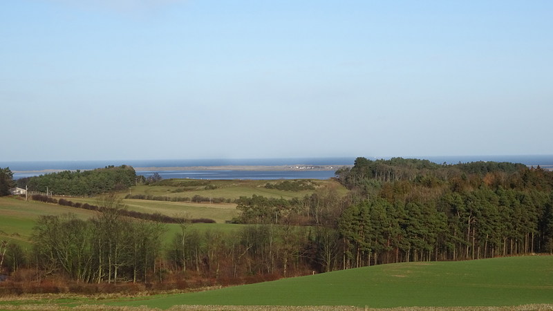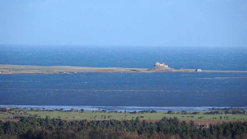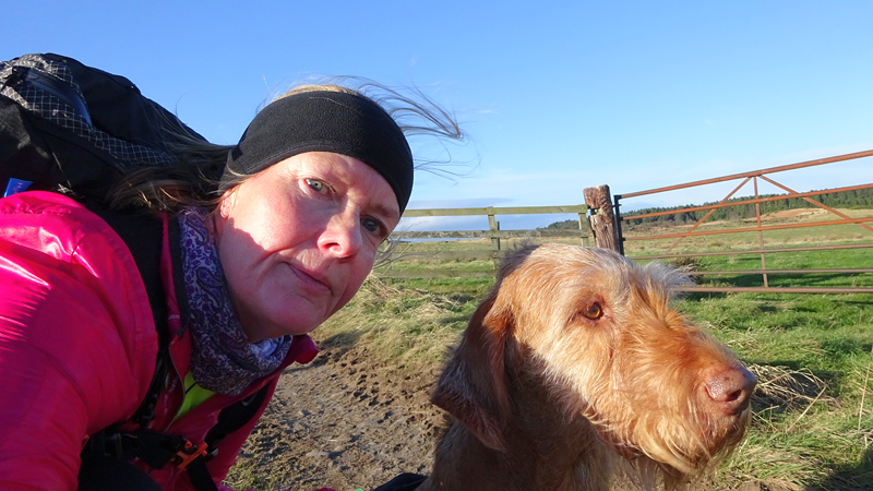 Op sommige stukken is de weg nog een beetje glad van de nachtvorst maar het ziet er prima uit allemaal. Op dit rare weggetje is niet gestrooid dus dat is fijn met waf! Ik weet al dat het begin van de route een beetje omhoog gaat, maar dat is allemaal best. Rustig aan, dan breekt het lijntje niet. Het is weer genieten en zelfs het weer wordt steeds beter. Alleen die wind is wel heftig. Maar dat kan me niet echt veel schelen. Hier geen zand, dus minder vervelend voor woef (en mij). et is heel helder, ik zie op een gegeven moment in de vere zelfs Holy Island liggen met het kasteel!