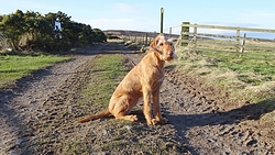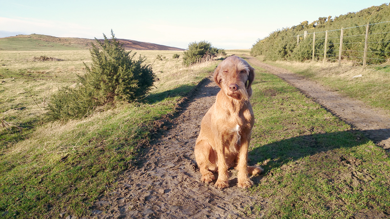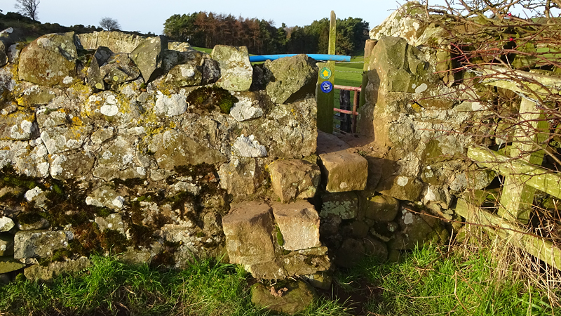 Nog even over een veld weer met uitzicht over Holy Island heel in de verte en dan weer die rare stile waar ik de vorige keer met moeite woeffie over/doorheen kreeg. Deze keer laat ik haar voorgaan. Ik wijs haar op het trappetje, dat neemt ze en dan kruipt ze onder blauwe ding door en loopt aan de andere kant weer naar beneden. Ik vind dat echt knap, maar het is net alsof ze ‘deze’ geleerd heeft en nog weet van de vorige keer. Des te beter.