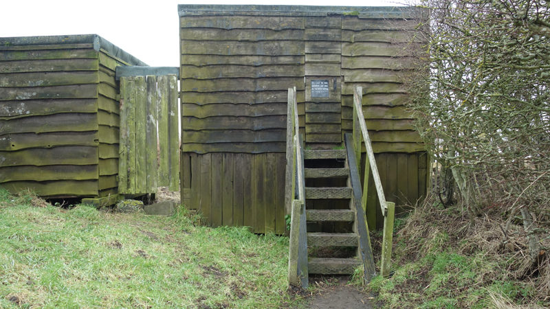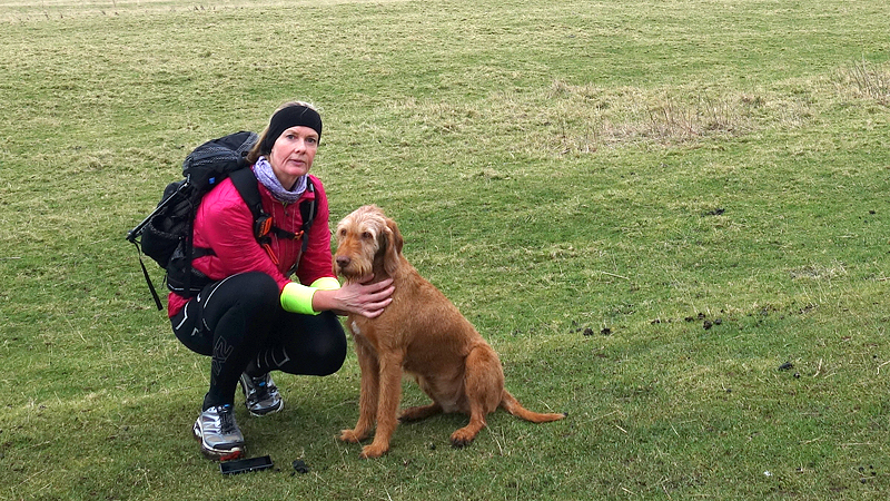 Ik hobbelde langs en over de golfbaan richting de duinen, door het parkje met de huisjes en langs de vogelkijk hut. Ik besloot deze keer even snel binnen te kijken of er toevallig iets bijzonders te zien was, maar het was natuurlijk grijs en somber en regenachtig dus er was niks. Wafje zat zoet te wachten in de kijkhut en bleef daarna braaf op me wachten totdat ik de trap af was gekomen.