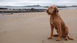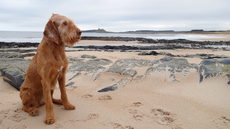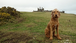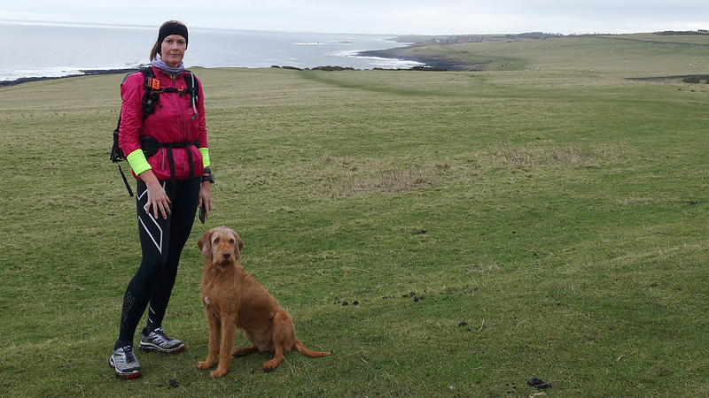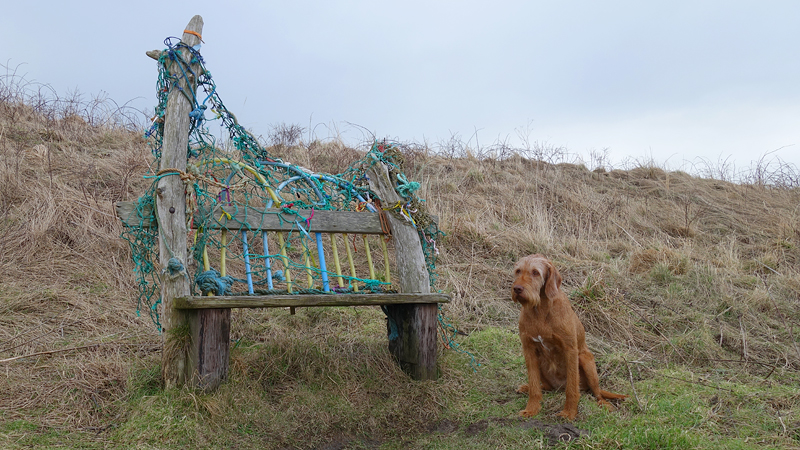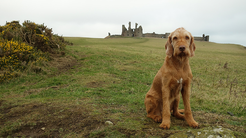 Ik besloot dus nu rechtsaf te slaan weer terug richting Craster te lopen. Inmiddels was het vrij slecht weer geworden en liep ik dus ook nog eens tegen de wind in. Maar dat mag de pret niet drukken natuurlijk en waf en ik rommelden rustig door. Al snel kwamen we bij de quarry van Craster en de parkeerplaats en stak ik de weg over naar een stukje bos om parallel aan het strand richting Dunstan Steads te lopen.