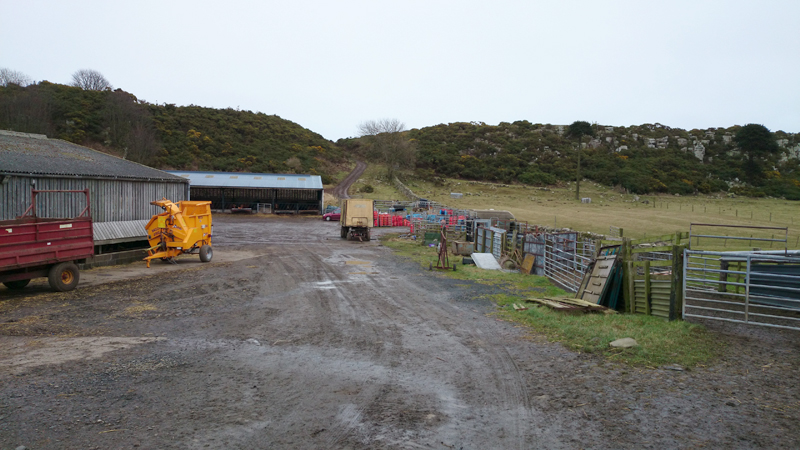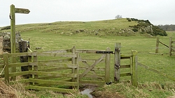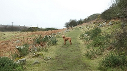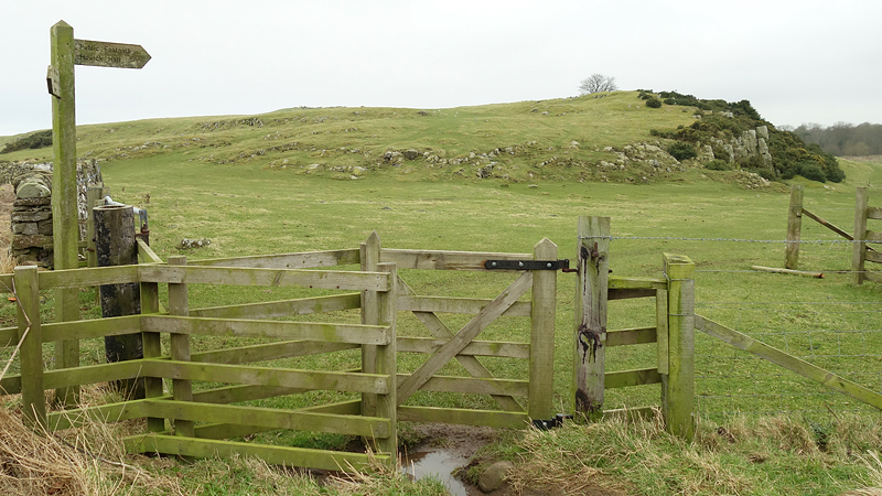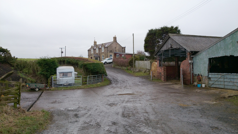 Toen ik was omgedraaid, vroeg ik me af wat voor pad eigenlijk links af liep in plaats van het pad langs de zee en kijkend op de kaart zag ik dat ik die route ook kon nemen terug richting Low Newton. Zo gezegd zo gedaan en al snel hobbelden waf en ik door een weiland omhoog en daarna naar beneden over een enorm modderpad/bad richting een rommelige farm waar een boer ons onverstaanbaar te woord stond. Werkelijk geen idee wat hij zei maar het was iets over de modder en de winter en mijn hondje (geloof ik).