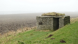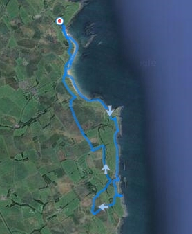 Daarna door Craster en achter de huizen langs in plaats van langs de zee op het modderpad Dat zou ik dan wel op de terugweg doen. Inmiddels was het aardig dichtgetrokken en miezerde het ook stug door. De wind wakkerde ook aan en daarom besloot ik niet langs de zee te lopen maar nu vast om te keren en eventueel door te lopen richting Beadnell.