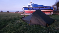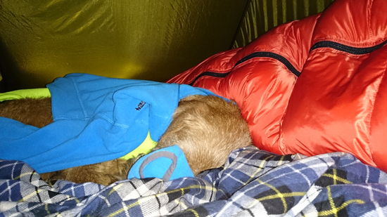 Ik had net voor zonsondergang de tent opgezet, met daarin mijn matrasje, het matrasje voor woef en haar ruffwear bedje. De slaapzak nog in de ortlieb waterproof valve bag. Dat leek me beter in verband met condens en koud worden.
